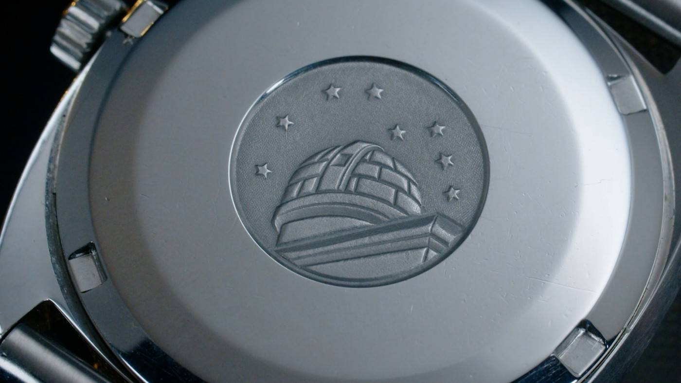 最后来个彩蛋,这是一枚上世纪60年代的欧米茄星座尊霸系列腕表。它拥有非常漂亮的壳型,因为这是尊达大师的作品。而在背后你也能看到,它的表底盖上有当年天文台竞赛的标识,还有非常漂亮的机芯。