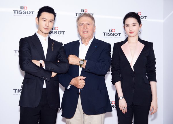 天梭表全球总裁弗朗索瓦-添宝先生(Francois Thiebaud)先生与天梭全球形象代言人黄晓明和刘亦菲合影