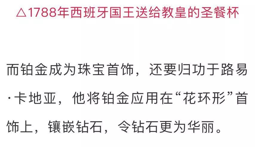 △1936英国乔治六世继位时,妻子伊丽莎白王后便以铂金镶钻皇冠加冕,图为伊丽莎白王后和少女时期的现任伊丽莎白女王 而且铂金坚韧耐磨,1克铂金可以拉成1,600米的铂金丝,相当于2个800米标准运动场的长度,即便这样,铂金丝也不会断裂。 正是铂金的坚韧特性与纯白色泽,缔造了它与钻石的完美搭配,既能牢固地镶嵌每一颗钻石,给予恒久的保护,又能最大程度地彰显钻石的光彩。