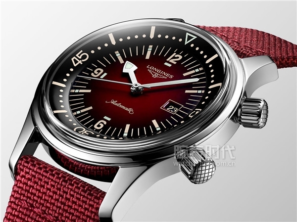 和其他浪琴传奇潜水员家族成员一样,新款腕表的设计精髓是它延续自初代潜水表的半圆形表镜和内置的双向表圈,这不仅赋予腕表些许复古韵味,更大大提高了腕表的辨识度。腕表右侧有2个表冠,其中4点位的表冠为常规表冠,调校时间和日期,2点位的表冠为内置表圈调校装置,佩戴者可通过表冠控制启止,以确定剩余的潜水时间。