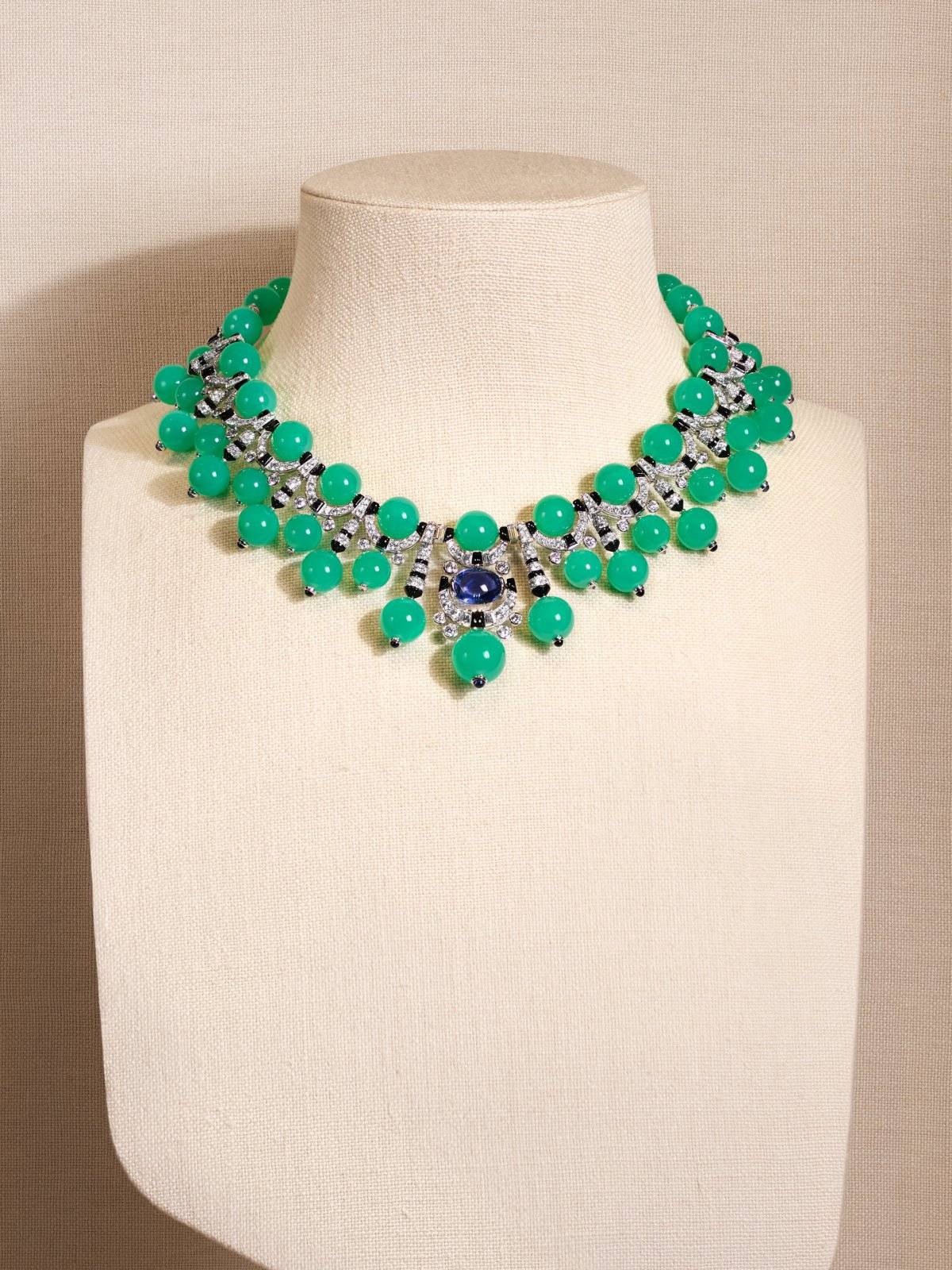 最新的“SEAFOAM GREEN CHAMANE项链”展示了立体几何造型的现代高就珠宝。采用绿玉髓、蓝宝石交相辉映,再由白色钻石和黑色缟玛瑙进行串联。