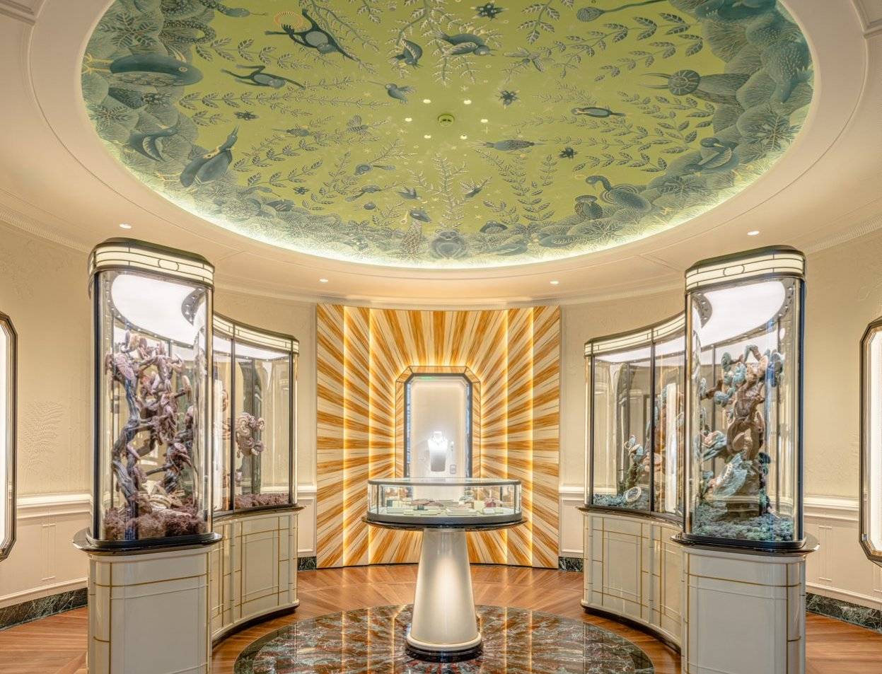 旗舰店内部被多个空间风格,呈现丰富的功能和美学造诣。门店入口的第一个空间遵循风水理念设计,在保留原有建筑的结构线条和对称美学的同时,营造能量和谐流动的意境。 宝诗龙邀请了多位国内外艺术家共创,为该空间进行穹顶画作、景观橱窗、中央橱窗、墙面装饰摆件、壁画、装置艺术等多种类型的艺术创作,其中中国森林里的林芝,随处可见的红和绿色系,翠竹、斑驳竹影等,多维度展现了宝诗龙作为一个法国文化对于中国文化元素的提炼和艺术再创作的把控力。