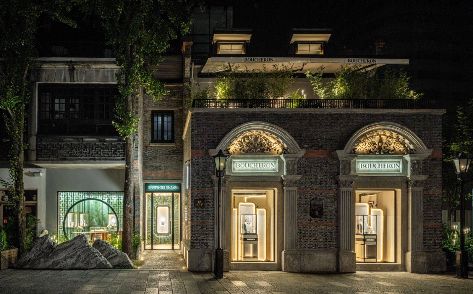 宝诗龙新天地中国首家旗舰店 法国高级珠宝世家Boucheron宝诗龙近期在上海新天地揭幕中国首家品牌旗舰店。宝诗龙中国传讯团队告诉界面新闻,这是继法国巴黎芳登广场、日本东京银座之后,宝诗龙在全球开设的第三家旗舰店型。 界面新闻记者在现场看到,该旗舰店坐落于上海传统石库门建筑内,门店有两层,占地面积为278平方米。宝诗龙延续巴黎芳登广场期间店的设计思路,依托上海独有的石库门建筑风格,保留建筑原有结构完整性的同时,将装饰艺术风格中的对称美学、金属装饰、祖母绿形切割等元素融入其中。 经由宝诗龙联手设计团队及多名艺术家之手,换新面貌的该石库门建筑处处展现着中法文化碰撞和中西美学交汇。 首先,宝诗龙请来景观工作室“鸣筑景观”在旗舰店内打造了两座庭院。其一为旗舰店入口处的法式庭院,是对品牌芳登广场旗舰店中的冬景花园的重新诠释。旗舰店的第二入口处则被设计为中国古典园林,用中式庭院中常见的“月洞门”进行不同空间的自然过渡。“月洞门”的四周则采用石雕、水景,以及中国古代地面纹样的马赛克石砖,辅以丰富的自然元素,营造浓郁的东方美学意境。